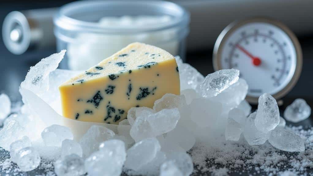 The thawing process of frozen blue cheese demands careful attention to preserve its quality and safety. For ideal results, thaw your blue cheese in the refrigerator for about 24 hours. This method helps retain moisture and texture while preventing bacterial growth.