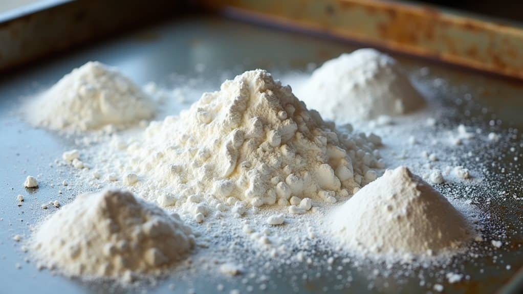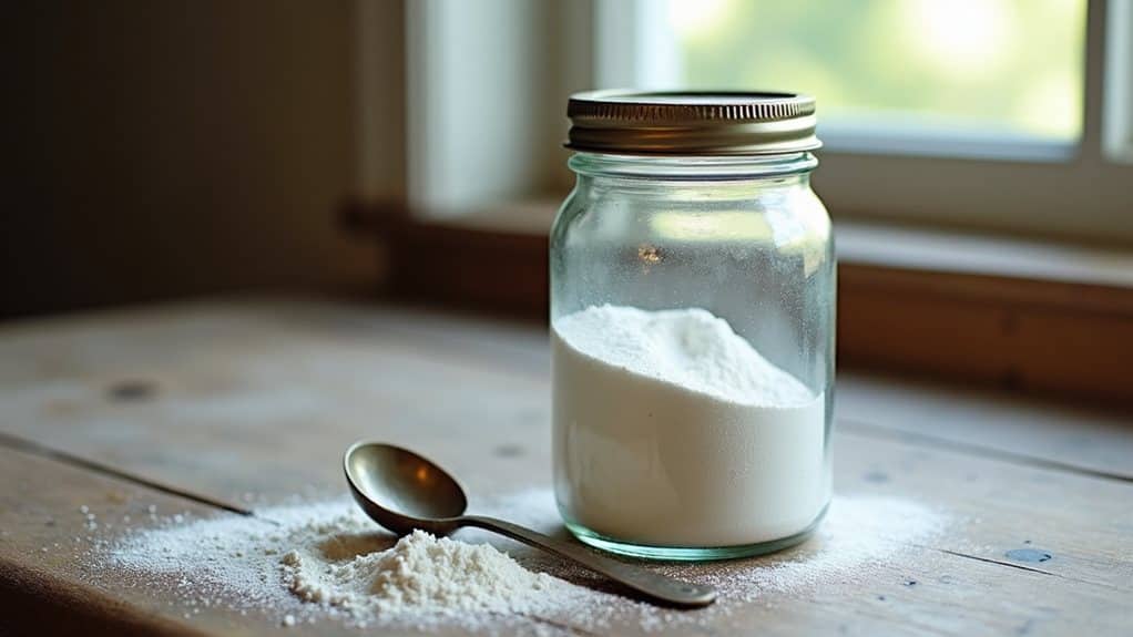 To protect your baking powder's effectiveness, you'll want to store it in an airtight container that shields it from moisture and unwanted odors. You can maintain proper humidity control by keeping your baking powder in a cool, dry pantry or cabinet, away from heat sources and areas prone to dampness. The ideal storage location should maintain a consistent room temperature, with your container placed on a higher shelf where it's less likely to encounter spills or moisture from everyday kitchen activities. Regular checks for clumping and moisture will help ensure your baking powder stays fresh and effective. Additionally, proper storage can significantly extend the shelf life of your baking powder, preventing it from going bad prematurely.