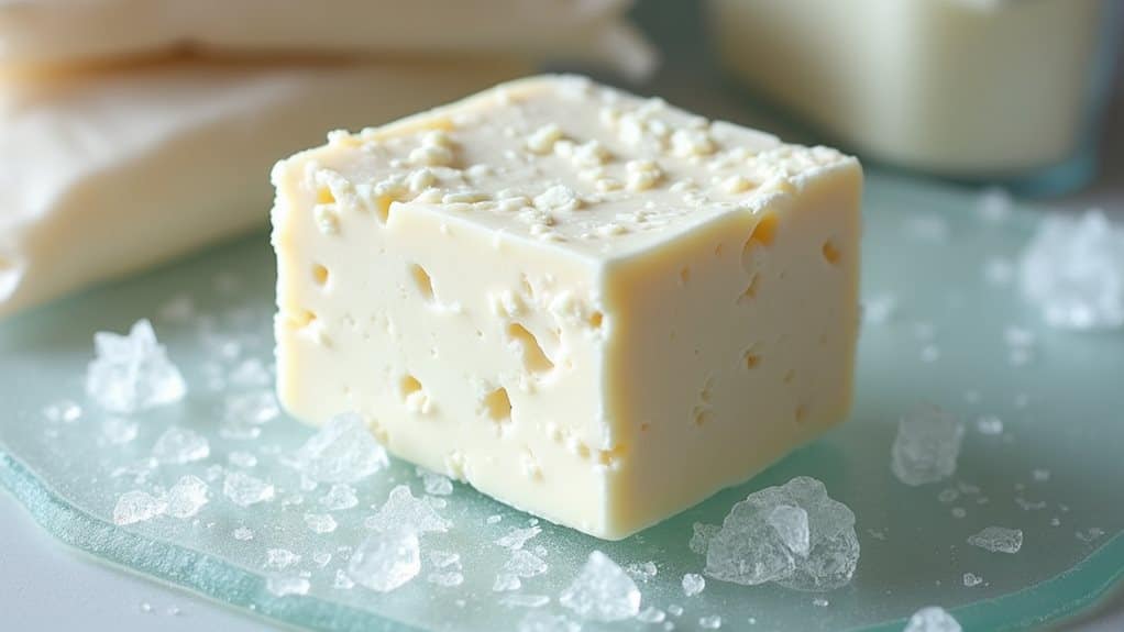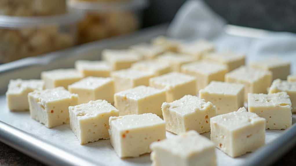 Yes, you can freeze feta cheese for up to three months while maintaining its tangy flavor and crumbly texture. To freeze feta properly, drain the liquid, pat the cheese dry, and cut it into smaller portions for easier thawing. Wrap each portion tightly in plastic wrap, then place in freezer bags with excess air removed. When you're ready to use it, thaw the cheese overnight in your refrigerator or use the cold water method for quicker results. For best preservation, you can also store feta in olive oil with herbs like rosemary and oregano in an airtight container. The following techniques will help you maximize your feta's shelf life and quality.