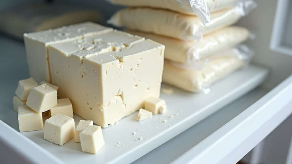 To protect your feta cheese during freezing, you'll want to use a double-wrap method by first covering it tightly with plastic wrap or aluminum foil, then placing it in a freezer-safe container or bag. Proper storage is crucial for maintaining freshness and nutrients, so make sure you've squeezed out as much air as possible from the outer container to prevent freezer burn and preserve the cheese's quality. Position the wrapped feta flat in your freezer, and don't forget to label it with the date since frozen feta maintains its best quality within the first month of storage. You can store feta cheese in your freezer for up to three months before quality begins to decline.