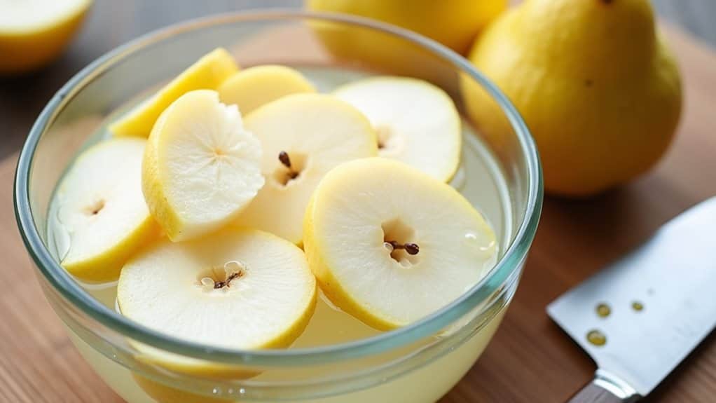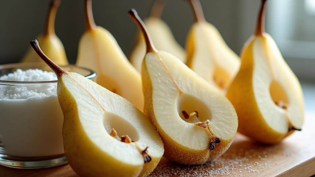 You'll need to treat your pears with an anti-browning solution before freezing, and you've got several reliable options to choose from, including a simple lemon water bath, a salt water soak, or a vitamin C powder treatment.