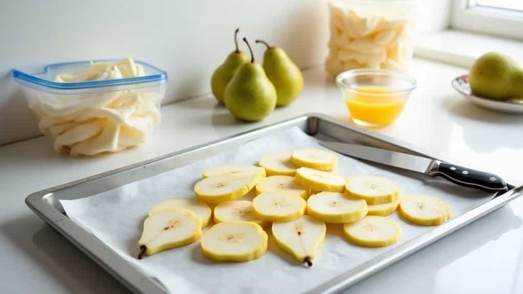 When it comes to treating your pears, you'll want bowls for anti-browning solutions and baking sheets for flash freezing. Prepare your workspace with parchment-lined sheets for optimal results.