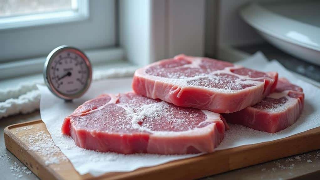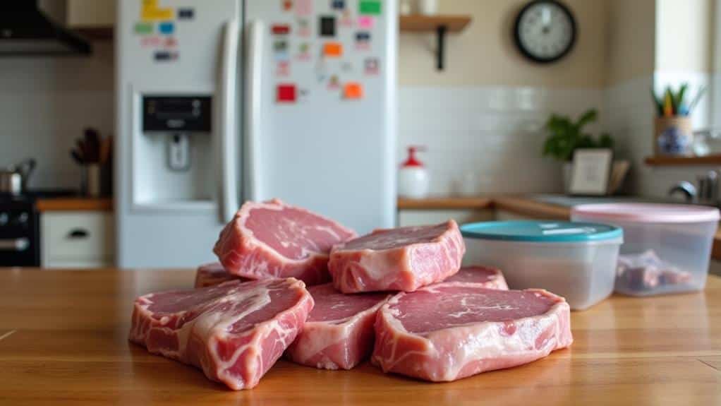 Pay attention to signs of spoilage and use appropriate thawing methods. By applying these tips, you’ll guarantee your pork stays delicious and safe to eat, maximizing its shelf life and your enjoyment.