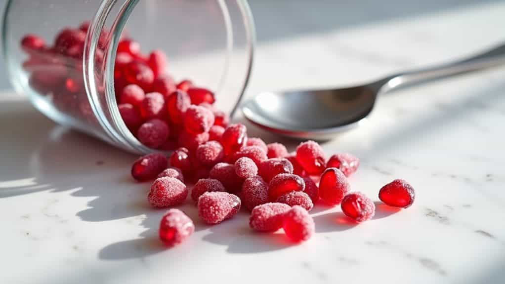 Powerhouse pomegranate seeds pack an extraordinary punch when frozen, offering numerous health benefits while maintaining their nutritional value. You'll get heart-healthy fiber, potassium, and zero cholesterol, plus powerful antioxidants that fight inflammation and protect against infections. In addition to these benefits, frozen pomegranate seeds retain their nutritional value when stored properly, making them an excellent choice for healthy snacking. Their versatility means you can add these nutrient-dense seeds to smoothies, desserts, and salads straight from your freezer, making healthy eating more convenient. Research shows consuming pomegranate seeds may deliver vitamin K and C to support your immune system and bone health.