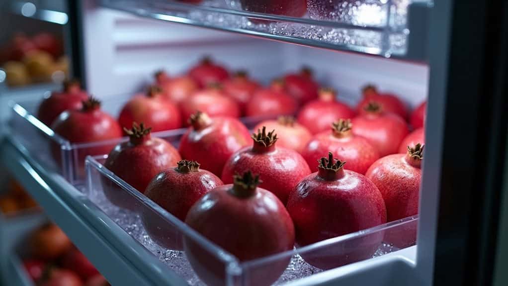 You'll want to keep your refrigerator's crisper drawer at a consistently cool temperature for ideal pomegranate storage, whether you're storing whole fruits or seeds.